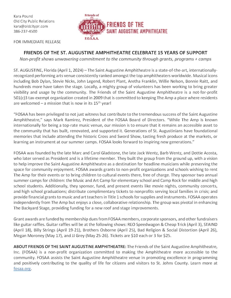 F.O.S.A.A. is a private, distinct, and separate organization from the St. Augustine Amphitheatre and St. John’s County.